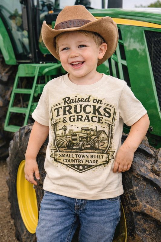Raised on Trucks and Grace Shirt, Farm Kid Tractor Shirt, Country Boy Tee, Small Town Kids Shirt, Western Toddler Shirt, Rural Kids Graphic Tee