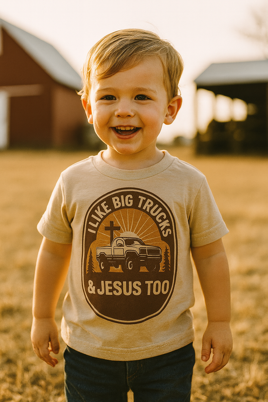 I Like Big Trucks & Jesus Too Toddler Shirt | Faith Based Kid’s Tee | Country Boy Outfit | Christian Truck Shirt | Farm Kid Tee