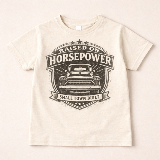 Raised On Horsepower Shirt – Small Town Built Kids Truck Tee – Farm Girl Shirt – Country Toddler & Youth Graphic Tee