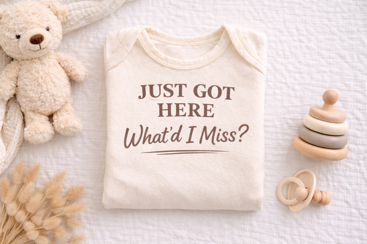 Just Got Here What’d I Miss Baby Onesie | Newborn Announcement Outfit | Neutral Hospital Going Home Outfit | Funny New Baby Bodysuit | Baby Shower Gift