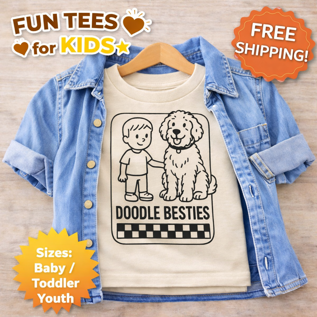 This adorable Doodle Besties toddler shirt is perfect for kids who are growing up alongside their fluffy best friend. Whether it's a Goldendoodle, Labradoodle, or any doodle pup, this tee celebrates that special bond between kids and dogs.