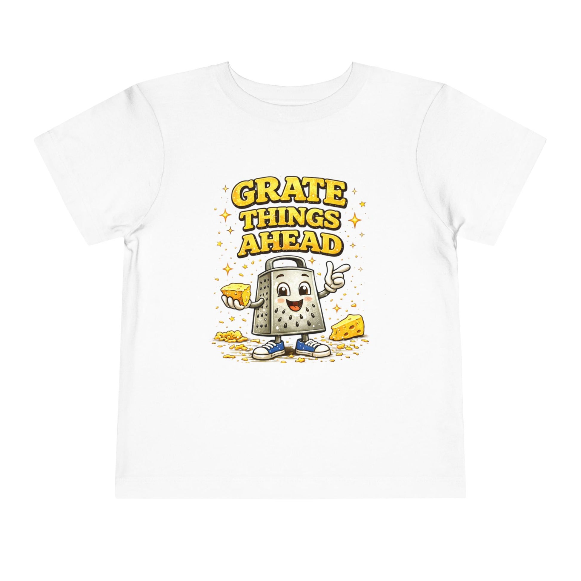 Our “Grate Things Ahead” toddler shirt features an adorable cartoon cheese grater with playful lettering — perfect for kids with big personalities and families who love a good pun.