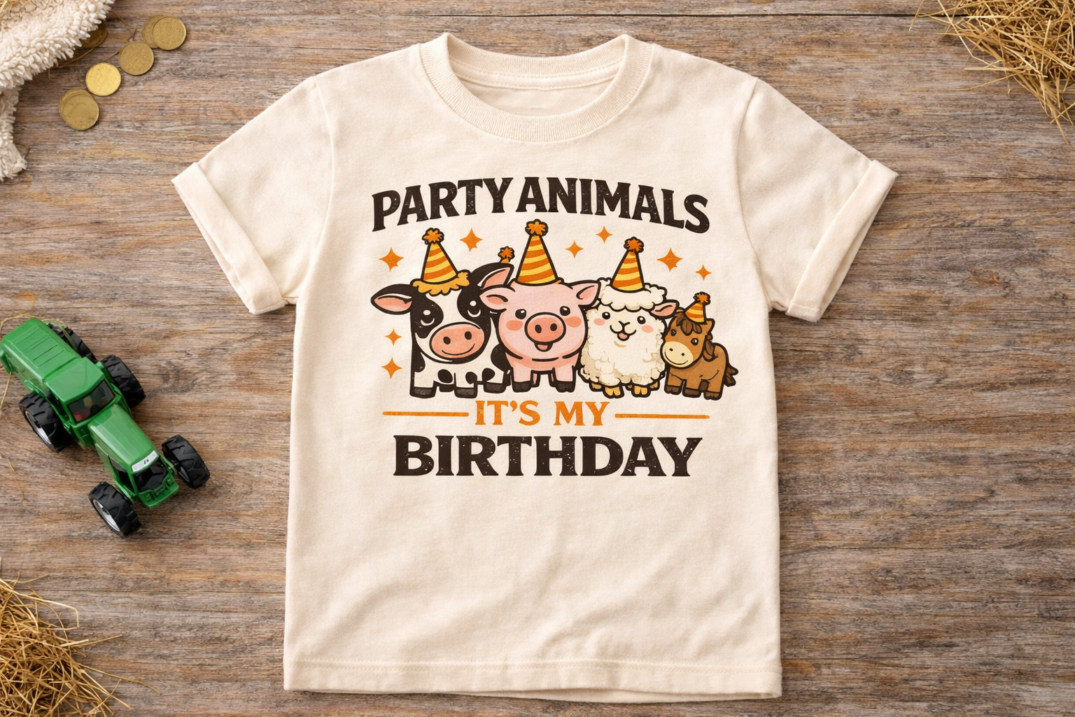 This Party Animals It’s My Birthday shirt is a fun and adorable choice for toddlers and kids celebrating in farm style. Featuring cute barnyard animals in party hats, this birthday tee is perfect for farm birthday parties, cake smash photos, barnyard themes, and playful party outfits for boys and girls. 🎉🐷🐮🐑